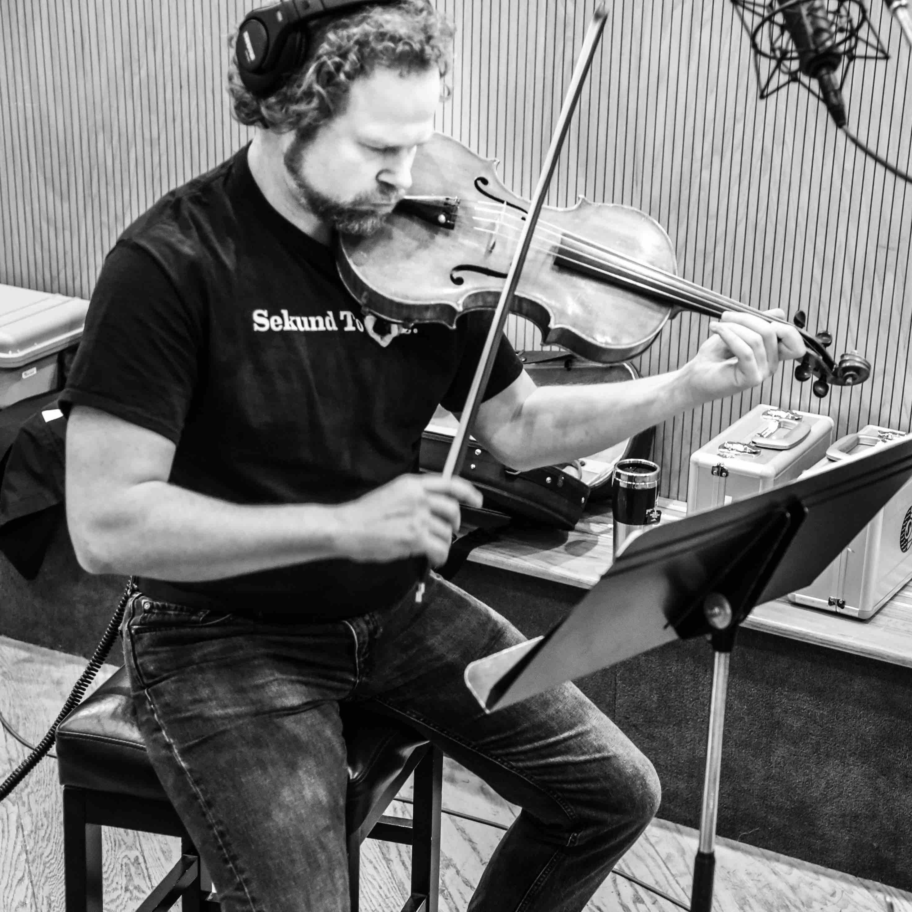At the end of day one, our final task was to overdub these solos. First, Alex recorded his polyphonic cello intro and outro to perfection. Fresh off of her 2018 Grammy-nomination for “Best Improvised Jazz Solo,” Sara Caswell delivered a “one-take wonder.” In musician’s parlance, this is when someone records an incredible first take, immediately recognized as unrepeatable and unsurpassable. After her final note, Sara smiled, put down her headphones and fiddle, and fairly leapt to the control booth to listen.